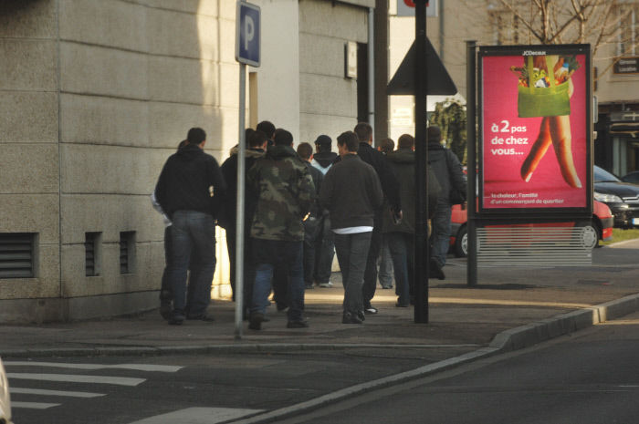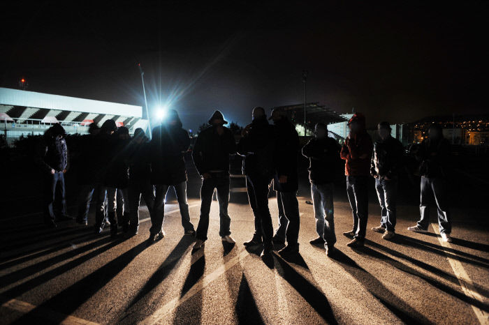 « Je commence à prendre du recule avec le milieu, aujourd’hui j’ai atteint la trentaine. Je n’ai pas que le foot dans ma vie. Mais pendant 10 ans il n’y avait que ça. Forcément il ne faut pas être tout à fait bien dans sa tête, mais pour moi, aucune femme ne m’a jamais donné les sensations d’un but », explique Jack d’une voix posée et réfléchie, cherchant lui-même à comprendre pourquoi il a passé tant d’années avec pour obsession de mettre ou de prendre une bonne raclée. « La première fois que je suis entré dans un stade, ce n’est pas le match qui m’a fasciné, mais les mouvements de la foule, j’étais hypnotisé », confie Jack, un des anciens leaders d’une firme de l’Est de la France qui commence doucement à se retirer. « Pourquoi ? Parce que pendant une fight on se vivant, tout peut arriver, alors les sens sont en alerte. Avant une rencontre j’ai la boule au ventre et des fois une semaine après, j’en suis encore à la purée et au jambon, les seuls aliments que je peux mâcher », raconte-t-il pour la première fois. Pour comprendre qui sont les indépendants, il donne un rendez-vous à une quinzaine de « collègues » une veille de match sur un parking vide derrière le stade. Ils arrivent en retard, après un jeu de cache-cache avec les voitures de la BAC longent déjà les artères alentours. Ils sont là, issus de trois firmes de l’Est, les Thugs, les Brizacks, la NCF. Une ambiance potache couvée par leur mascotte féminine de 26 ans qui a intégré le mouvement depuis10 ans. Le jour, elle travaille dans le marketing, à 80% du SMIC, tandis que les soirs de matchs, elle filme en tremblant pour ses potes, ces scènes de guérilla urbaine. Pas vraiment de sales gueules. Plutôt des petits durs à cuir. Chacun a intégré une firme pour une raison différente. Tous pourraient raconter à l’origine de leur histoire, un évènement fondateur ou répété, quelque chose qui a mal tourné. On les imagine sans peine trimer sans reconnaissance, avec des parcours scolaires difficiles, ou effectuant des jobs sous pression de la loi des petits chefs. « C’est nous les méchants », lance l’un d’eux sur le ton de la bravade. Puis ils essayent de convaincre, d’expliquer qu’ils s’inscrivent dans la tradition des bastons des bals populaires, que le besoin de violence, d’un étendard à défendre plutôt que soi-même a toujours existé. Le discours est construit de bric et de broc, mais dans l’ensemble, terriblement cohérent. Ce qu’ils racontent, c’est l’histoire d’un manque. Pour eux, la société moderne a définitivement bouclé la boucle de la violence qui constitue un strict monopole d’Etat. Les confrontations humaines, « mano a mano », sont prohibées de loin en loin. A un différent qui pouvait autrefois se terminer par une bagarre, se substitue aujourd’hui la judiciarisation du système. Le procédurier, justement protégé par la loi, l’emporte sur la loi sauvage du plus fort. En visant efficacement à la sécurité, paradoxalement, la Justice dépouille ces individus se sentant vivre sous le joug de la mécanique du système d’un vestige identitaire : la possibilité de s’imposer, de gagner, d’apposer une marque par force en dehors du monde du travail perçu comme un jeu pipé et par extension toute forme de victoire s’inscrivant dans un cadre social tolérable. Si les combats sur les rings et les remises de médailles sont des formes de violences admises auxquelles de nombreux fighters s’adonnent régulièrement, elles ne suffisent pas à remplir leur soif de confrontation. Le combat de rue constitue pour eux une alternative, justement parce qu’il est socialement inacceptable. Parce que chaque fight est un déchaînement de violence, une fissure à ciel ouvert dans le système, procurant l’adrénaline d’un vécu tangible, uniquement déterminé par la volonté de se battre. A la fin d’une fight, celui qui a tenu bon en première ligne est un homme D1, respecté par tous, celui qui est resté en arrière est « un vendeur de gaufres ou de pop’corn ».